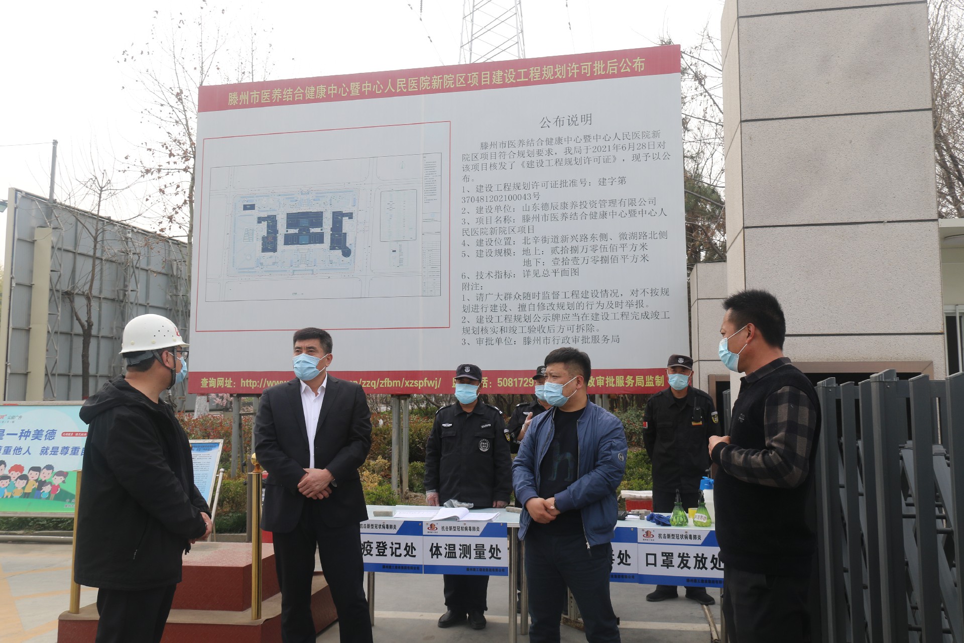 蔡成奎先后來到棗科技術交流中心項目、小崗區域回遷改造項目、滕州市北辛路小學初中部項目、滕州市中心人民醫院新院項目調研督導。在項目現場,蔡成奎主動配合現場管理人員查驗“三碼”、測溫等防疫檢查,在詳細詢問項目人員、車輛進出情況后,蔡成奎又仔細察看項目出入人員臺賬、車輛管理登記表等,了解當前疫情防控各項措施落實等情況。